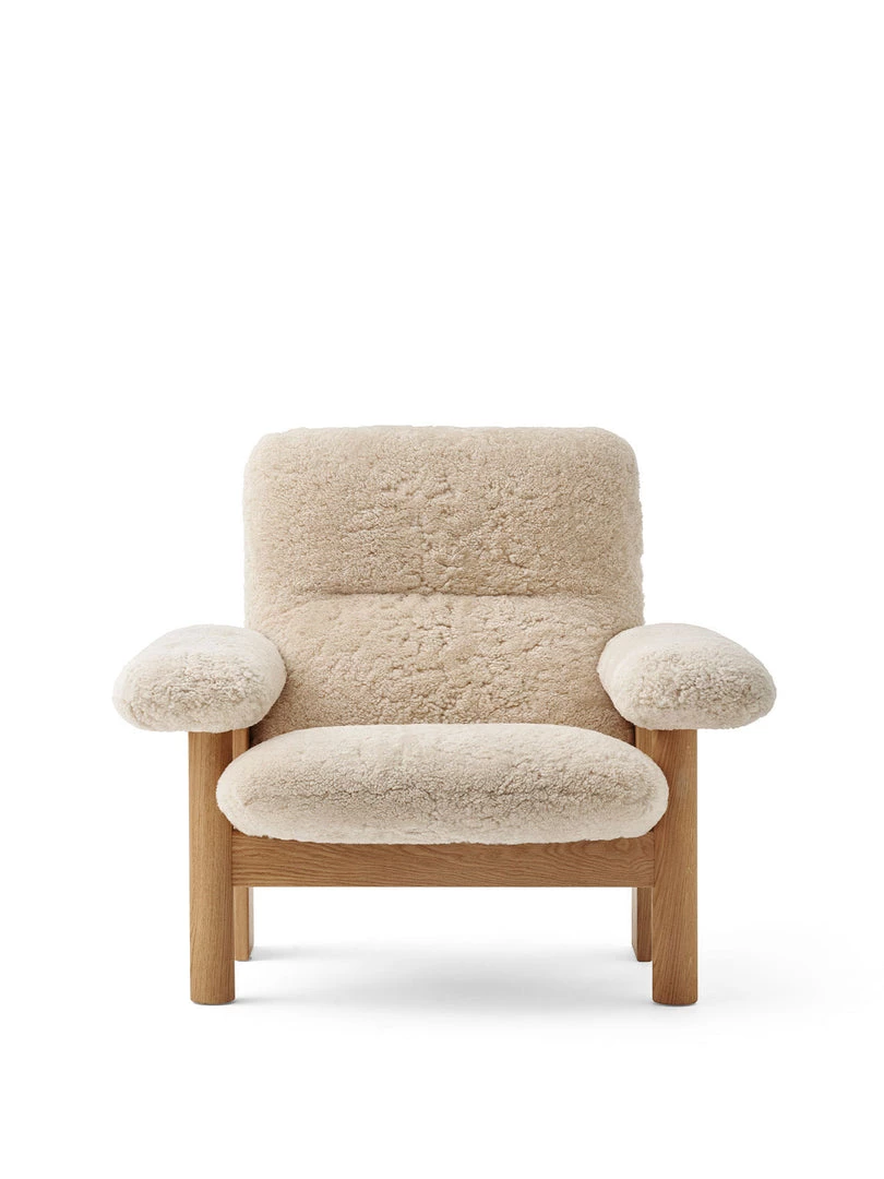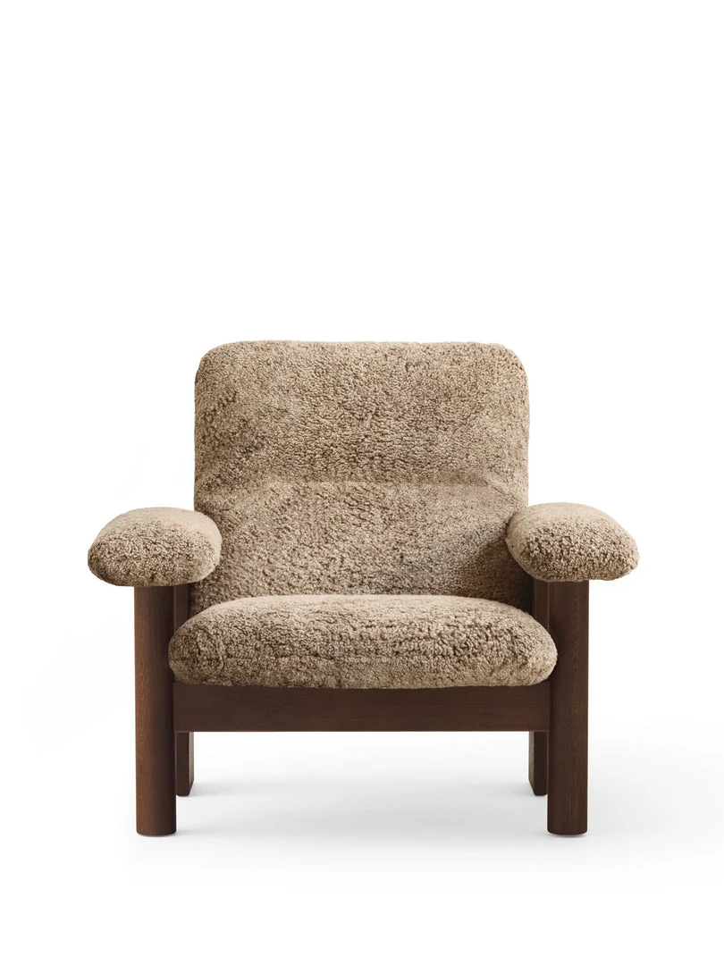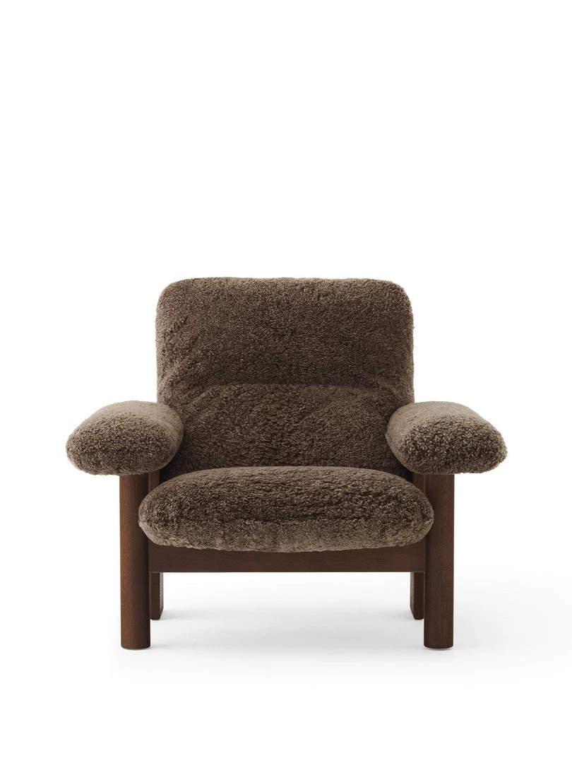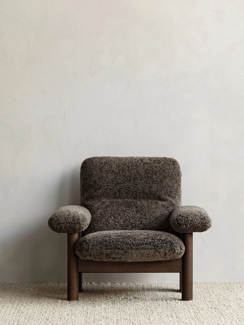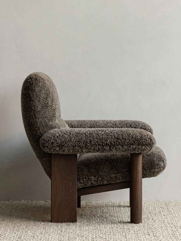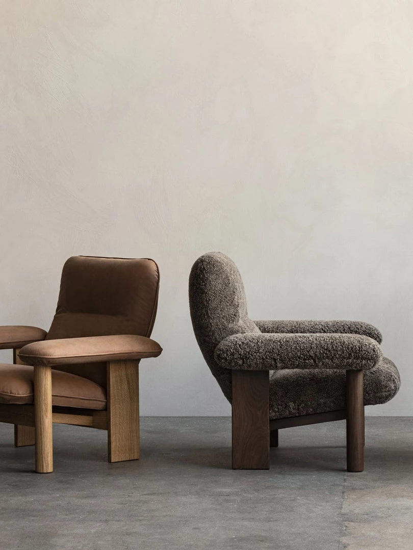 Scandinavian mid-century design aesthetics and Brazilian Modernism meet on the low-lying Brasilia Lounge Chair, designed for MENU by Anderssen & Voll. The luxurious armchair-lounge chair hybrid offers unparalleled sitting comfort thanks to its robust frame and soft upholstery. Characterized by its stout and sturdy legs, made using traditional joinery techniques, and exaggerated armrests and cushioning seat and backrest, upholstered in a range of soft fabrics, it creates a sense of comfort and ease in any setting.
