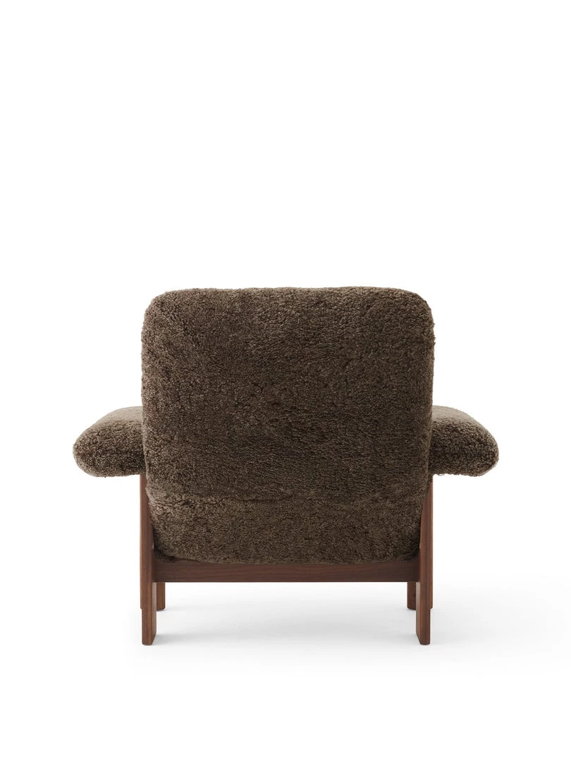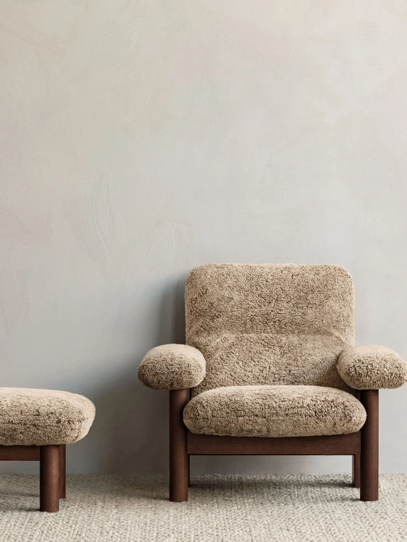 Lounge chair and ottoman: Solid oak of choice or walnut, foam, and sheepskin
