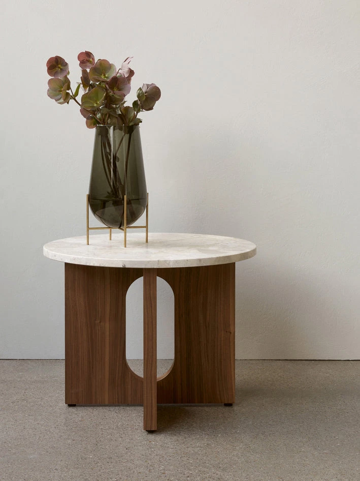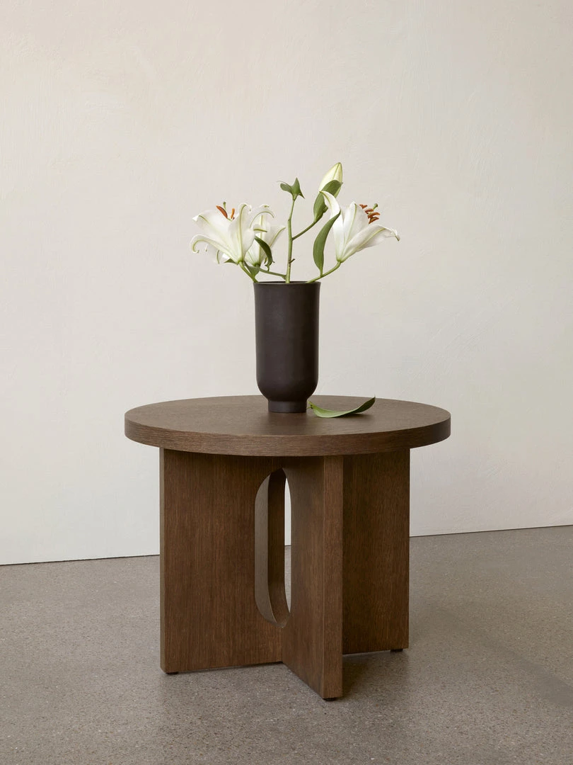 Perfectly proportioned with an intriguing combination of masculine and feminine elements, the Androgyne Side Table is a lesson in contrasts. Making clever use of craftsmanship, the round tabletop overhangs the wide, flat legged base in a meeting of solid and soft lines. Both base and top are sold separately and are available in natural or dark stained oak, walnut and Kunis Breccia stone respectively for a complete and customized furniture piece.