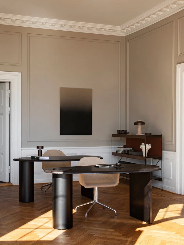 The Eclipse Desk is a celebration of materials and form. Named after its concave and convex form that resembles the illuminated passage of celestial bodies in the sky, the Fred Rigby design has a distinctive, asymmetrical silhouette that invites to touch. Available in solid oak, dark-oiled oak and oiled natural oak with a black painted leg, the tabletop is fitted with a lid that lifts to reveal hidden storage within the supportive steel column, ensuring desk space remains free of clutter. Designed to stand alone as a centerpiece in the middle of a room or for placement up against a wall as a more conventional piece of home office furniture, its intriguing form draws the eye.