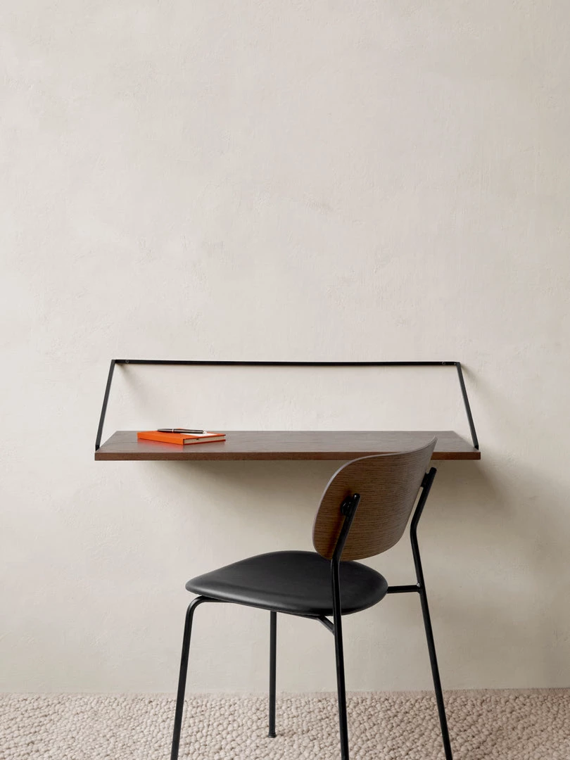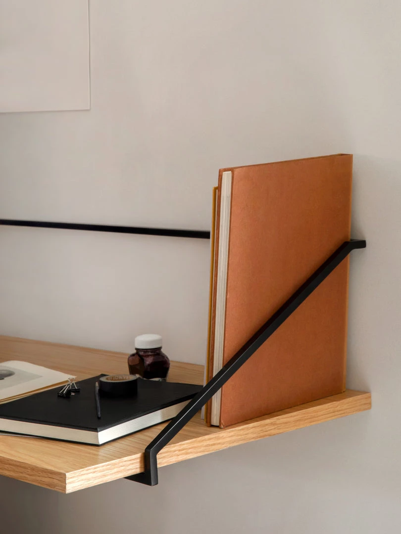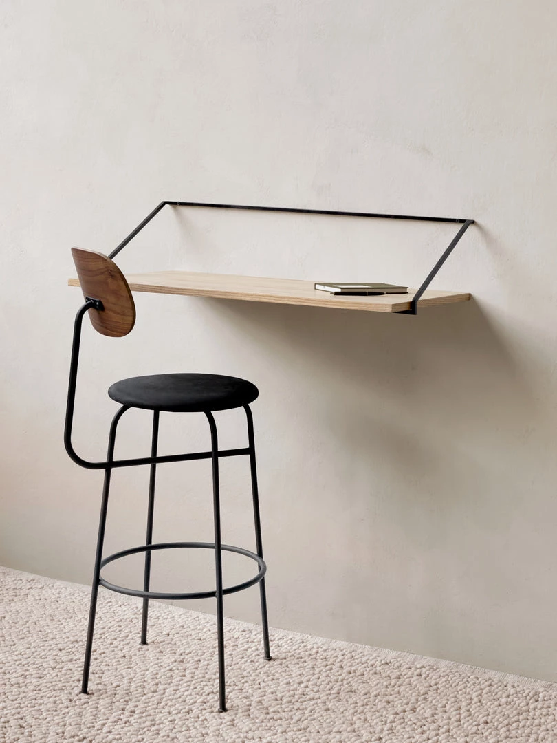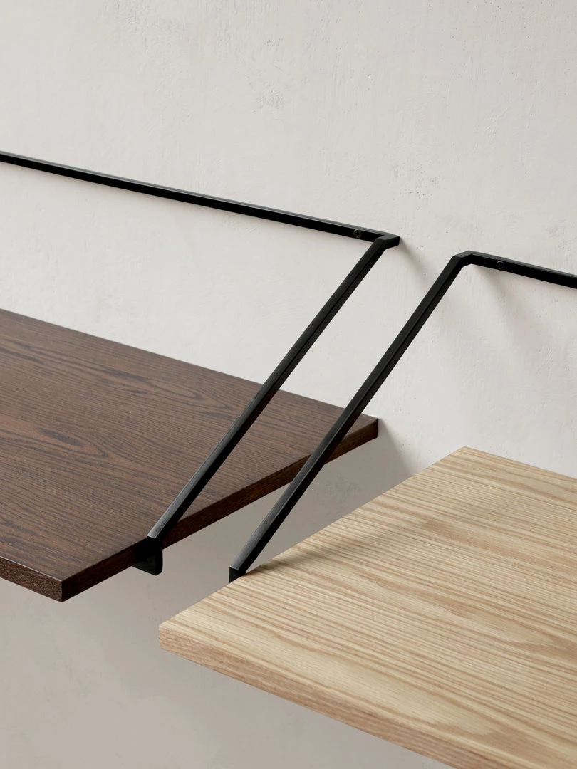 MENU’s new Rail Desk, imagined by Japanese designer Keiji Ashizawa, explores the way in which we use space and how design elements can be adapted to serve different functions. Looking to the world of architecture, the neat, precision-made piece conveys a sense of serene practicality. With multiple functions, as a desk, counter or shelf to store books, hung at any height you choose, it lends itself to almost any setting and fits neatly into living areas as well as bedrooms where space is at a premium. The minimalist steel bracket attaches to a wall and takes its cues from the handrail of a staircase. The wooden platform, available in natural or stained oak, provides a tactile contrast to the precision metalwork.