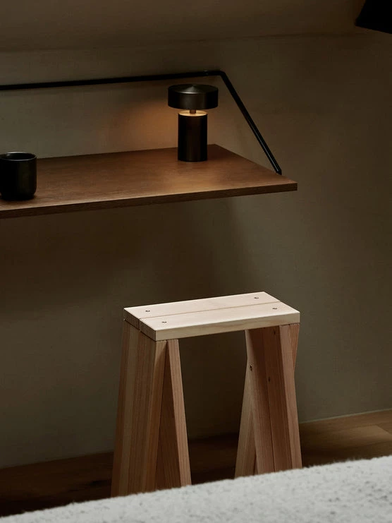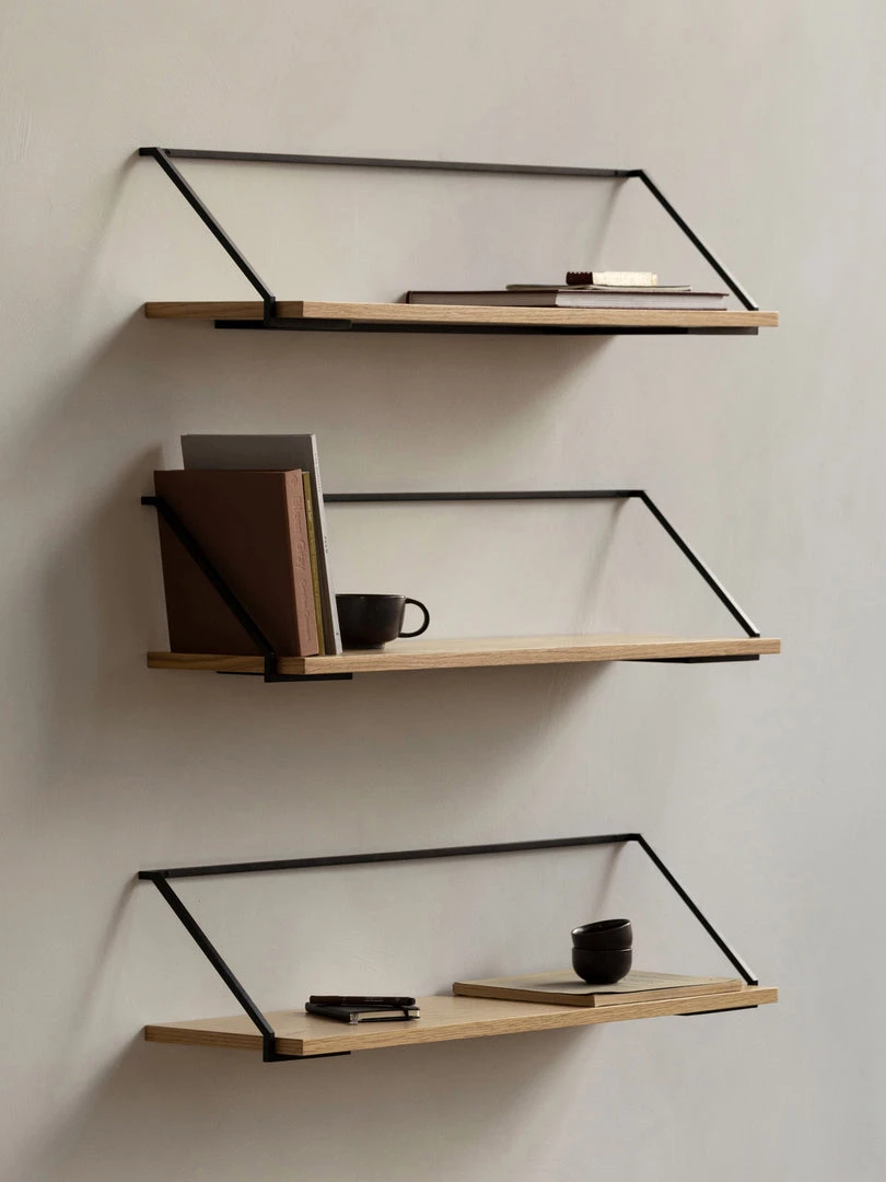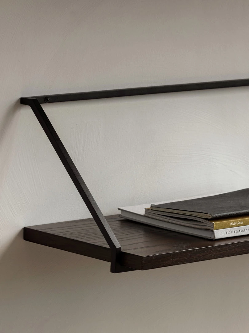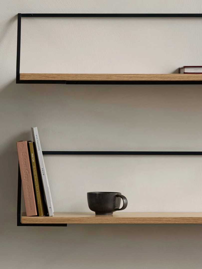 The Rail Shelf, created for MENU by Japanese designer Keiji Ashizawa, takes its cues from the world of architecture and the way in which we use space. The wall-mounted design features a lightweight steel bracket, inspired by metalwork handrails, and a tactile wooden shelf, offered in natural or dark stained oak. Elegantly minimal, Rail Shelf fits neatly into spaces to provide an understated backdrop for favorite objects.