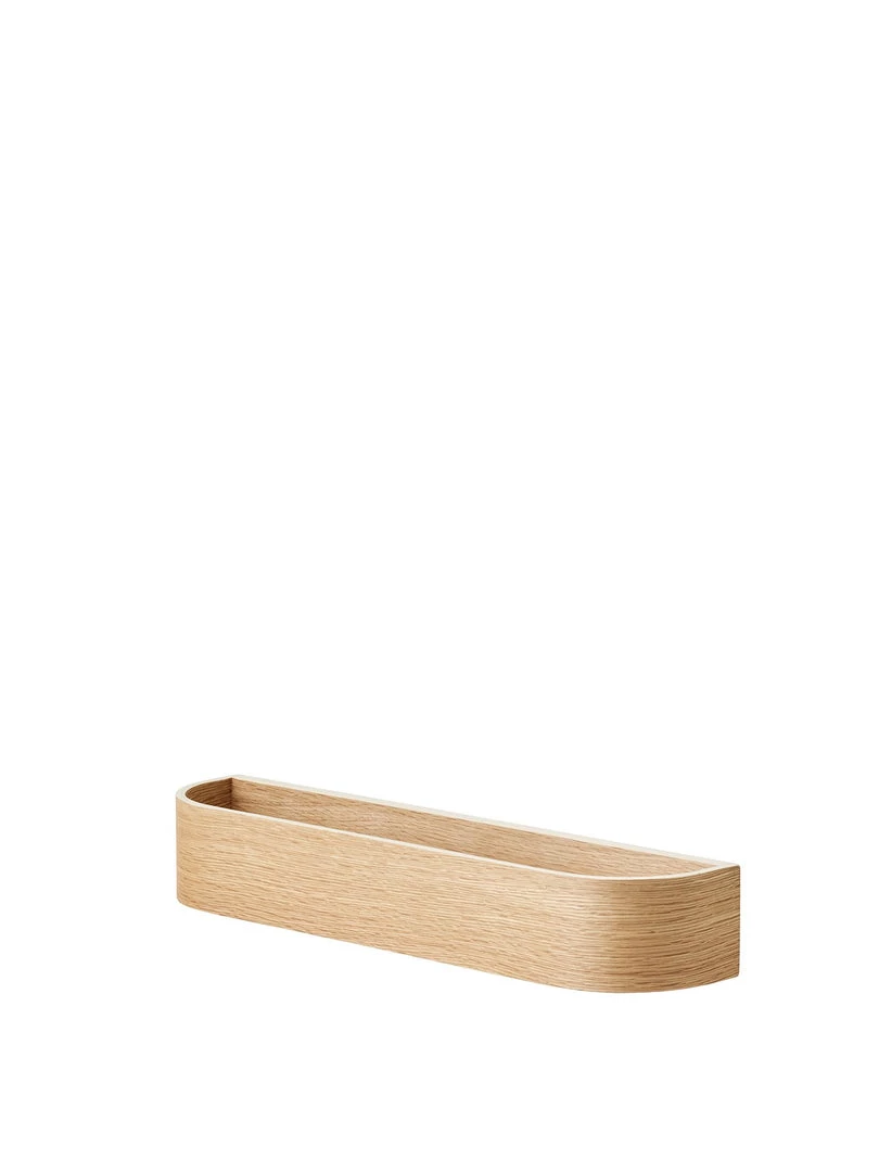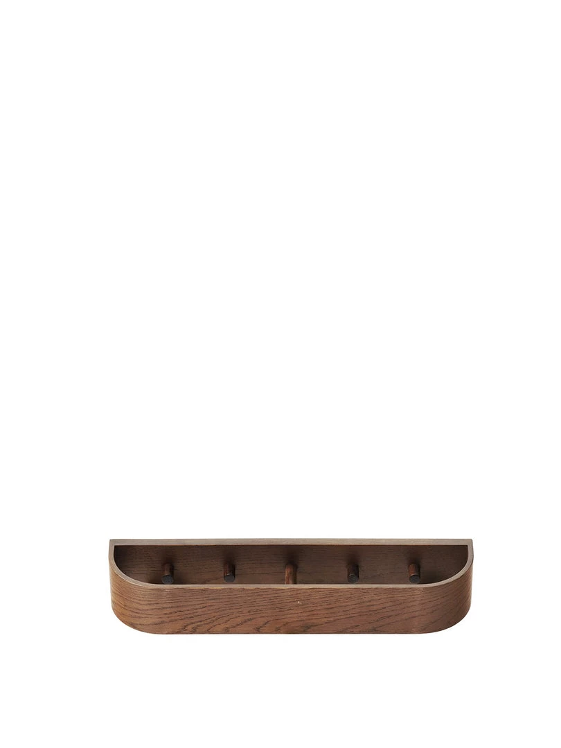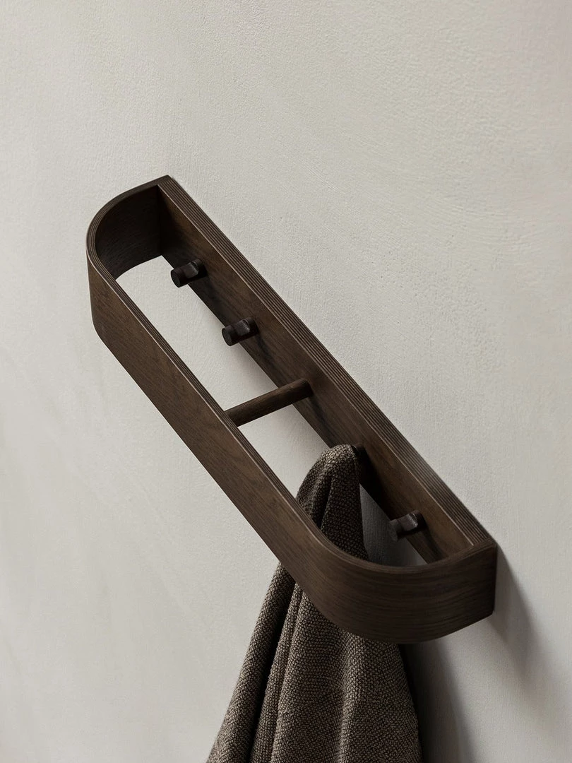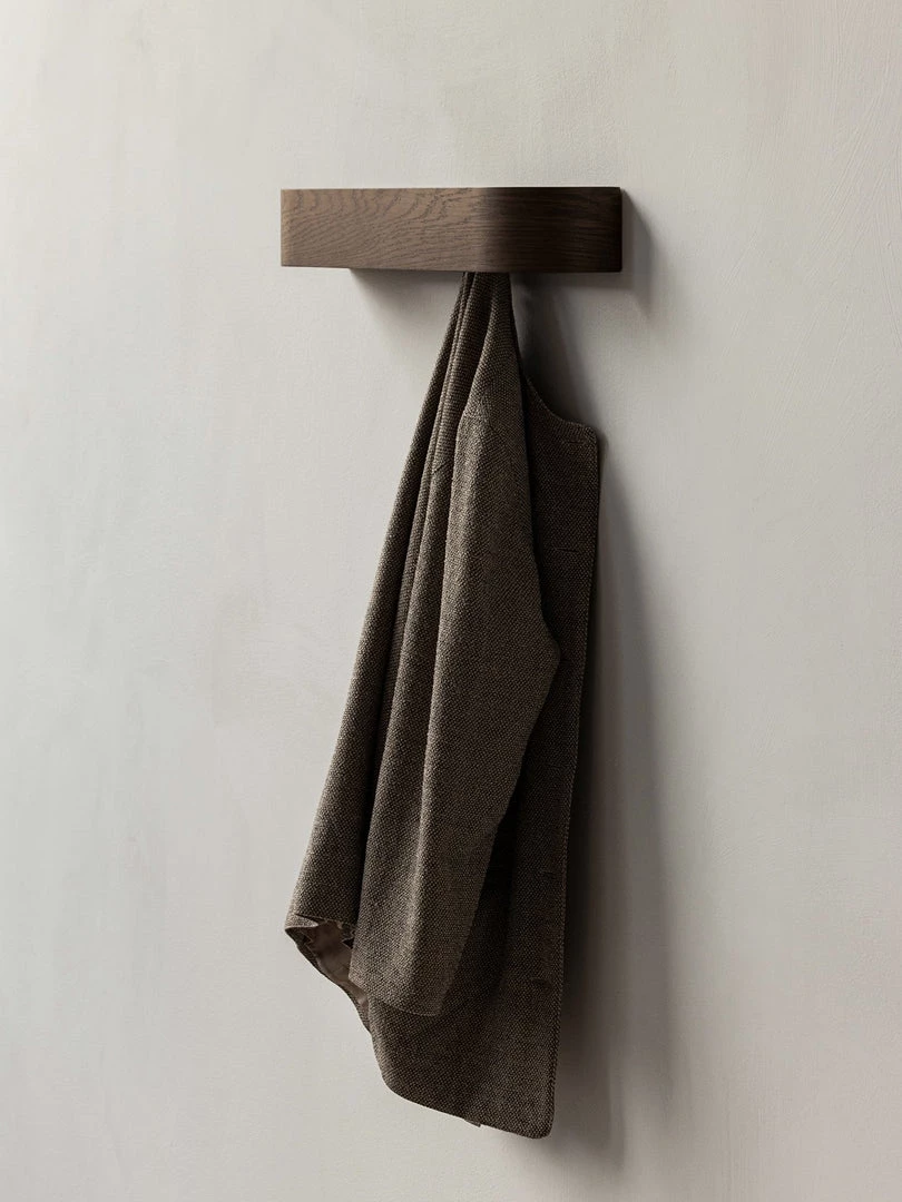 Clean lines, intuitive function and innate beauty define the Epoch Clothes Rack by Nina Bruun, one of two new designs from the Danish designer. Updating the ubiquitous coat rack and working from the idea of concealing unsightly hangers and tags behind something beautiful, the minimally elegant design profiles a considered combination of gently rounded edges, warm wood and discreet functionality. Developed and perfected over time, it is characterized by soft bands of undulating wood that sit like sculptures on a wall. Referencing 1950s design aesthetics and traditional craftsmanship, Epoch is pure in both form and material. Available in natural or dark stained oak, it is carefully sized to fit both purpose and place.