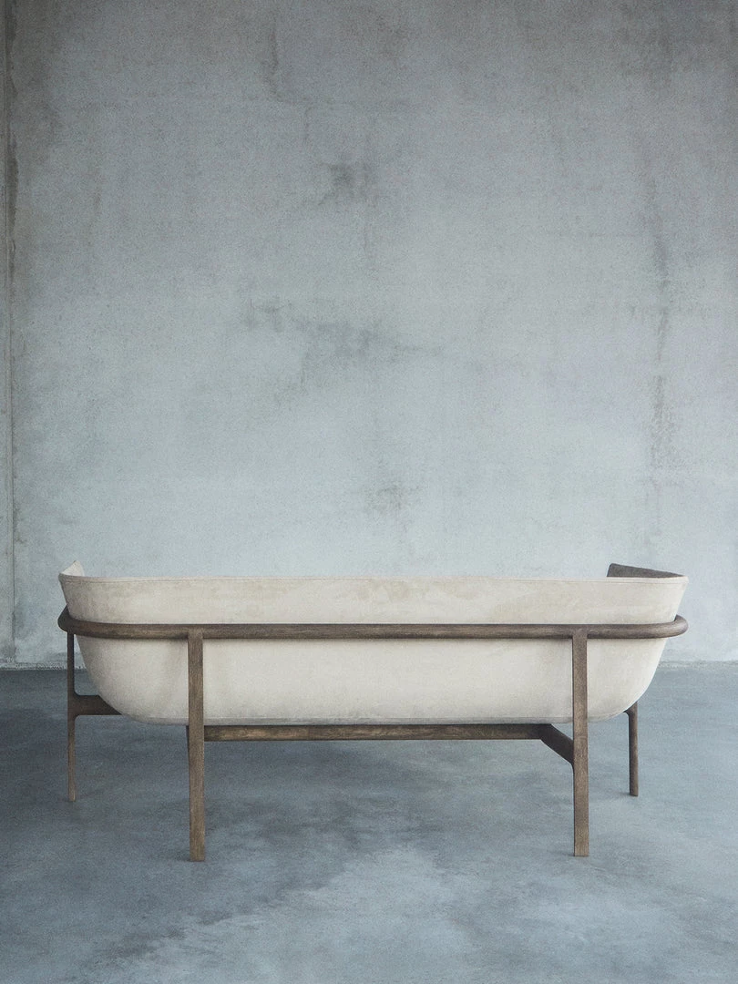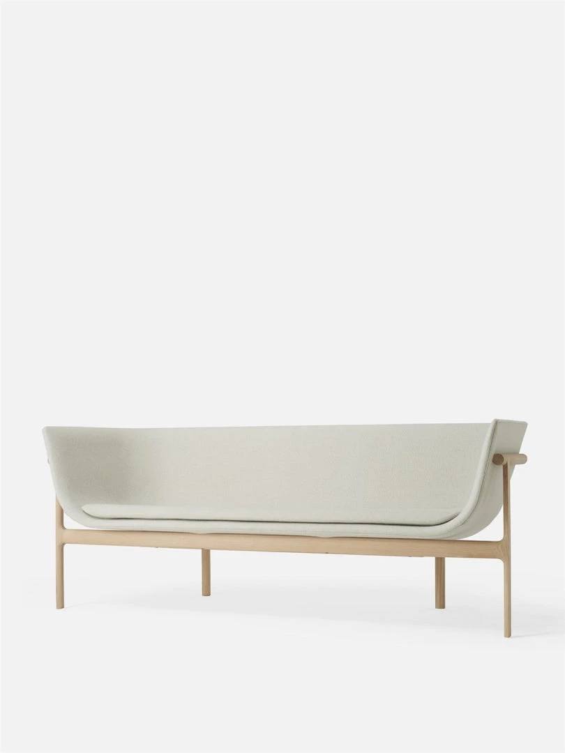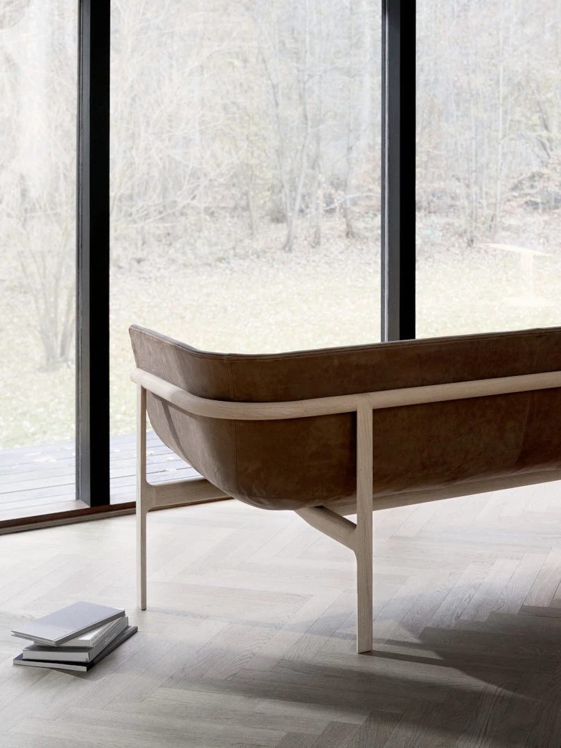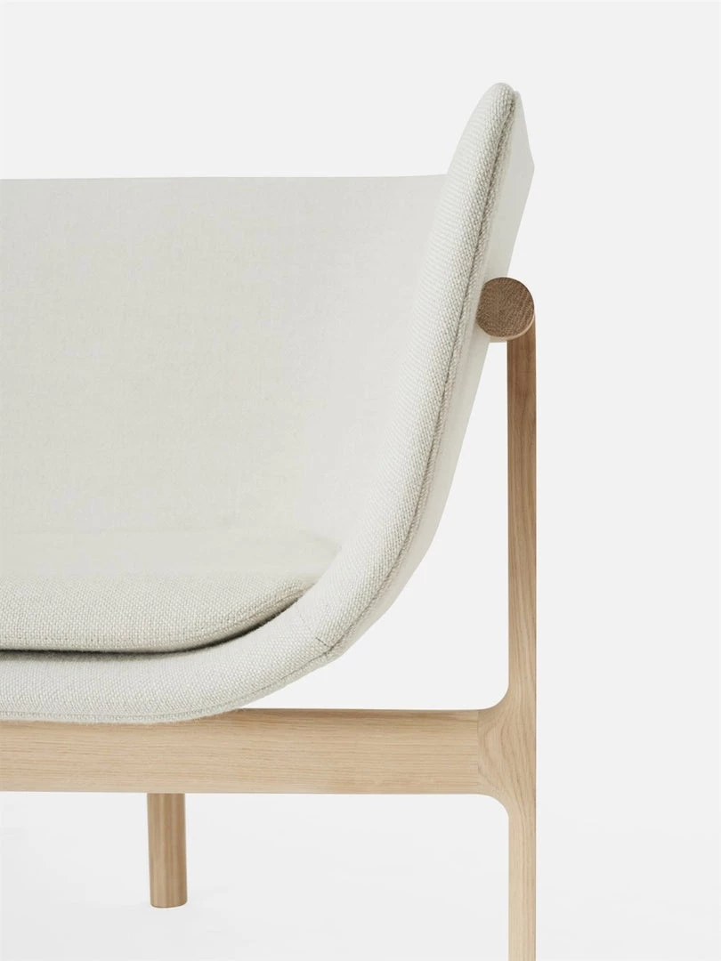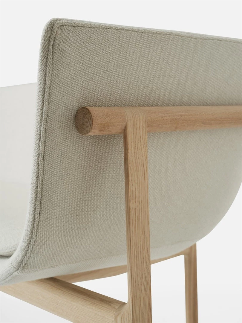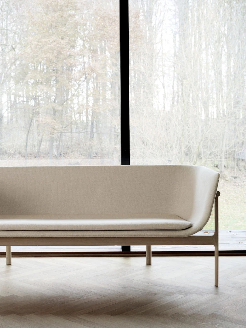 Portuguese designer Rui Alves was inspired to create The Tailor Sofa by the memory of his grandfather’s favorite tailor shop. An image of the tailors bent over work tables and of old wooden hangers holding grey suits has stayed with Rui. Like that tailor shop, he has designed the Tailor Sofa to be authentic, with everything on display: I wanted to show all of it, the structure, the beautiful oak wood. Nothing should be hidden, as is normally done in sofa design. The sofa is meant to be seen from all sides.”. It is especially beautiful from behind. The sofa has a light and airy appearance, the structured upholstered part supported by the wooden frame for a comfortable and practical sofa for everyday use.