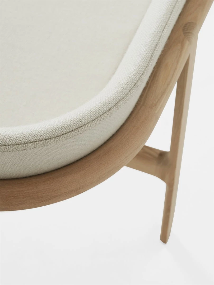 The frame is made of oak wood and holds a foam shell covered upholstery. The detail in the wood and the upholstery give the sofa a handmade look and all the wood joints are carefully designed to follow the round shape of the sofa.